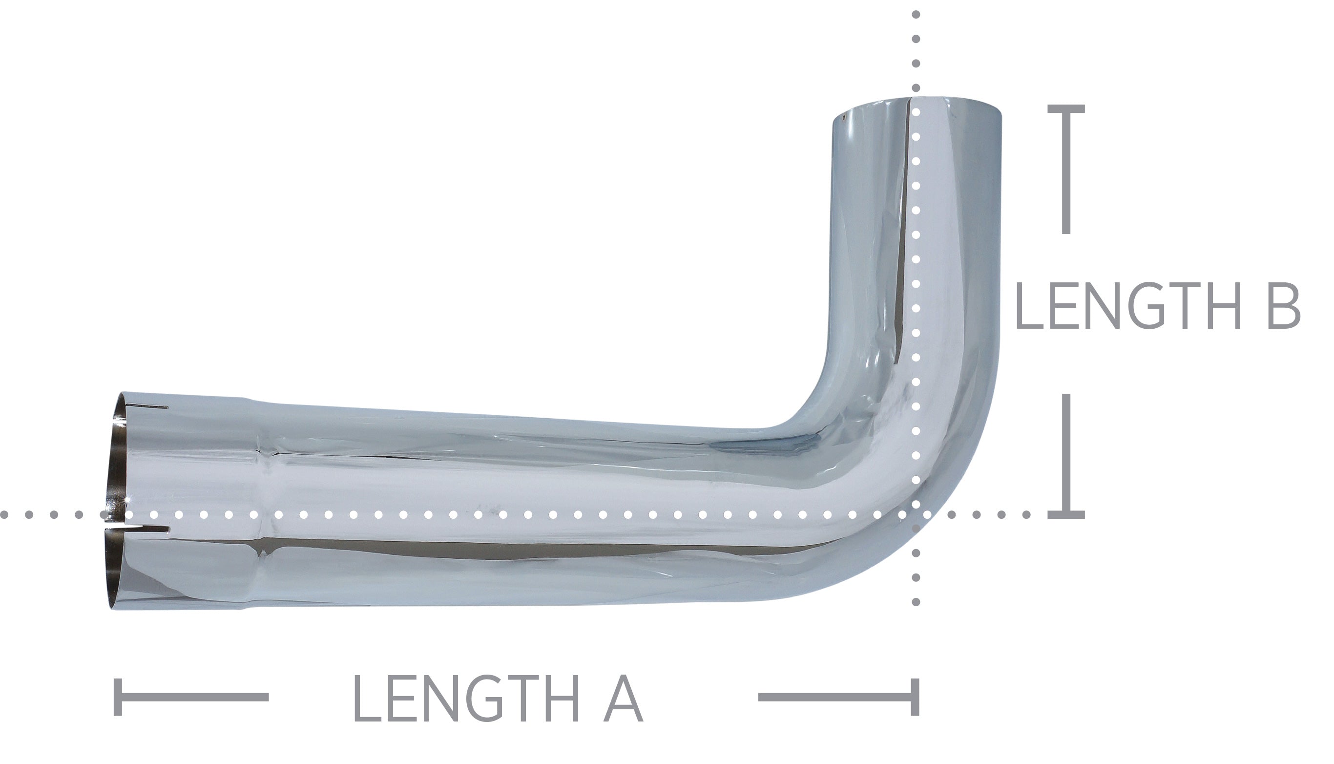Chrome plated exhaust elbow for universal application with 90° tight radius bend angle.
