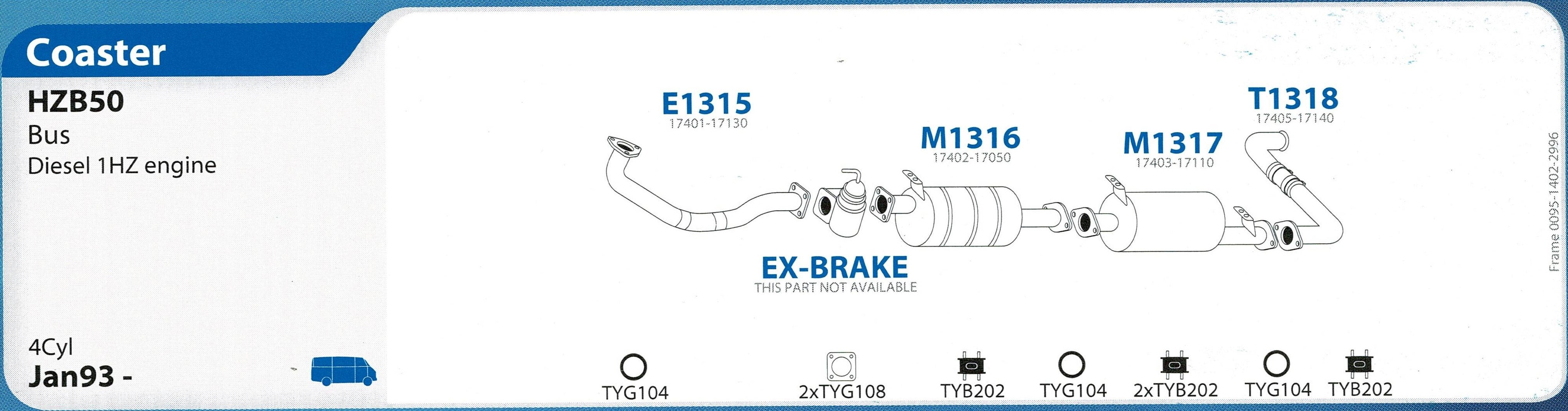 Direct fit, factory replacement Australian-made rear muffler assembly to suit Toyota Coaster HZB50/HZB50R buses with 4 cylinder 1HZ diesel engines, manufactured from 01/93 onwards.