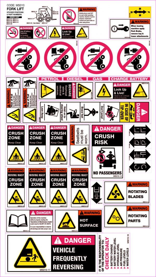 These machinery sticker sets are supplementary decal sheets designed to complement those originally supplied with your equipment. They feature all the commonly recognised risks and hazards required by local occupational health and safety (OH&S) regulations. Included are labels for crush zones, hot surfaces, pressurised systems, pinch points, rotating parts, knock-over and collision warnings, filler labels, and cab warnings. Everything you need to complete your risk assessment and ensure your machinery complies with local OH&S standards.