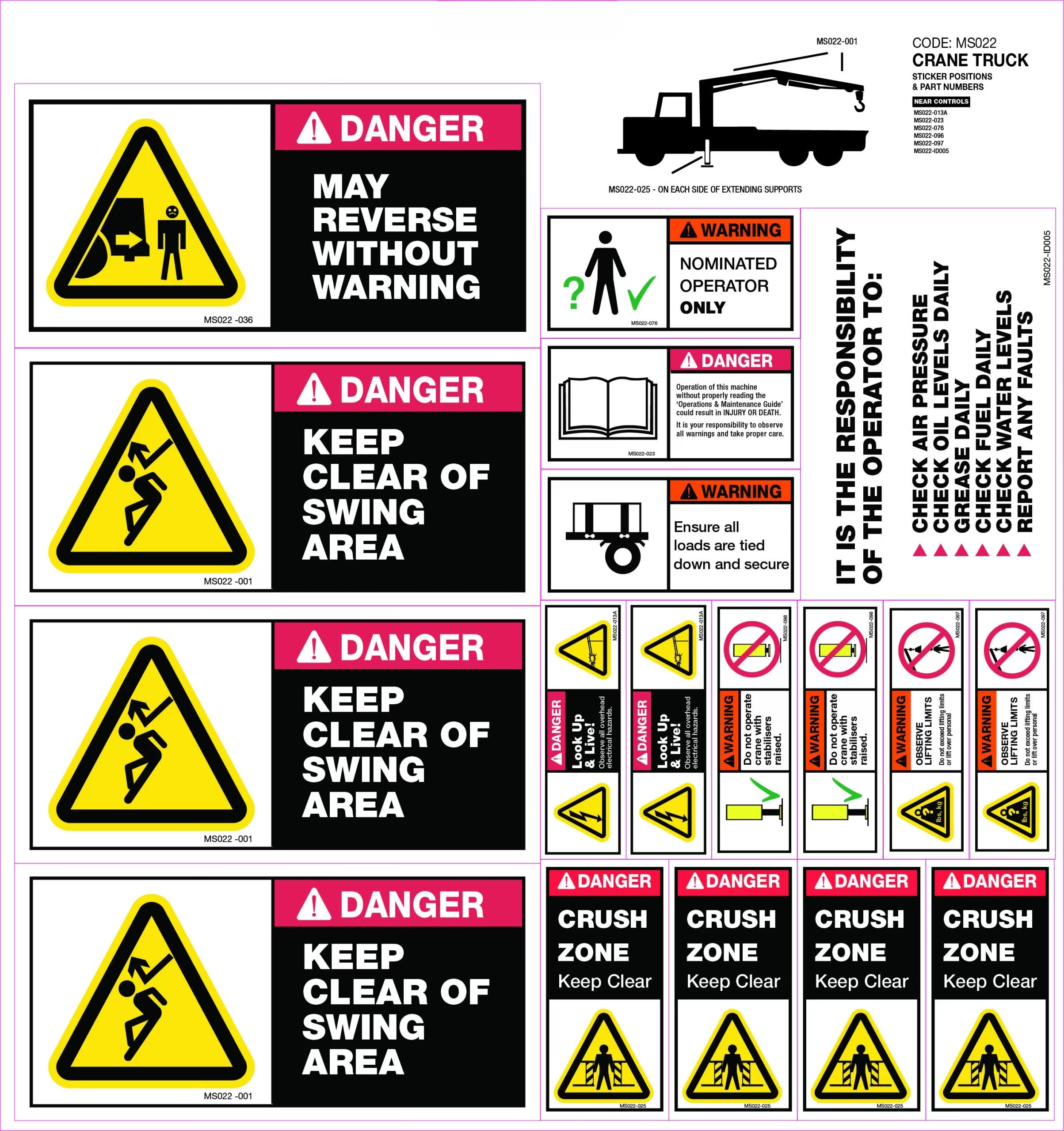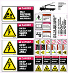 These machinery sticker sets are supplementary decal sheets designed to complement those originally supplied with your equipment. They feature all the commonly recognised risks and hazards required by local occupational health and safety (OH&S) regulations. Included are labels for crush zones, hot surfaces, pressurised systems, pinch points, rotating parts, knock-over and collision warnings, filler labels, and cab warnings. Everything you need to complete your risk assessment and ensure your machinery complies with local OH&S standards.