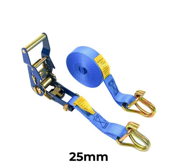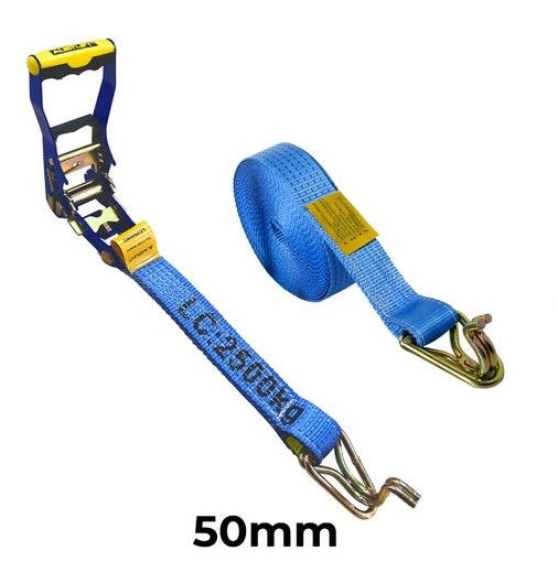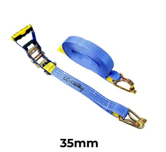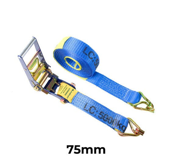 Manufactured from high tenacity polyester webbing, with heavy duty hook and keepers stamped with lashing capacity. Heavy duty powder coated ratchet buckle.